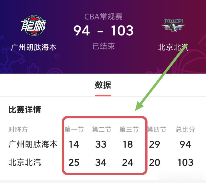 4月8日, 广州朗肽海本男篮94-103输给了北京北汽男篮,广州男篮前排行第14,要思进季后赛,还差两名,按照本场比赛的流露来看,广州男篮照旧很有契机插手季后赛名单的;而北京男篮本场比赛,因为赵睿,曾凡博等中枢缺席,合座实力下落,不外好在还赢下了比赛,也以60积分排到了CBA积分排行榜的第三名。