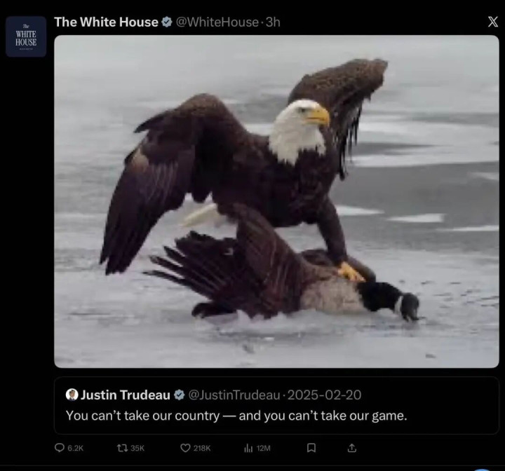 哪知说念,白宫已而贴出一张图,图中,凶悍的白头鹰猛扑加拿大鹅,哀怜的大鹅,被踩在脚底。