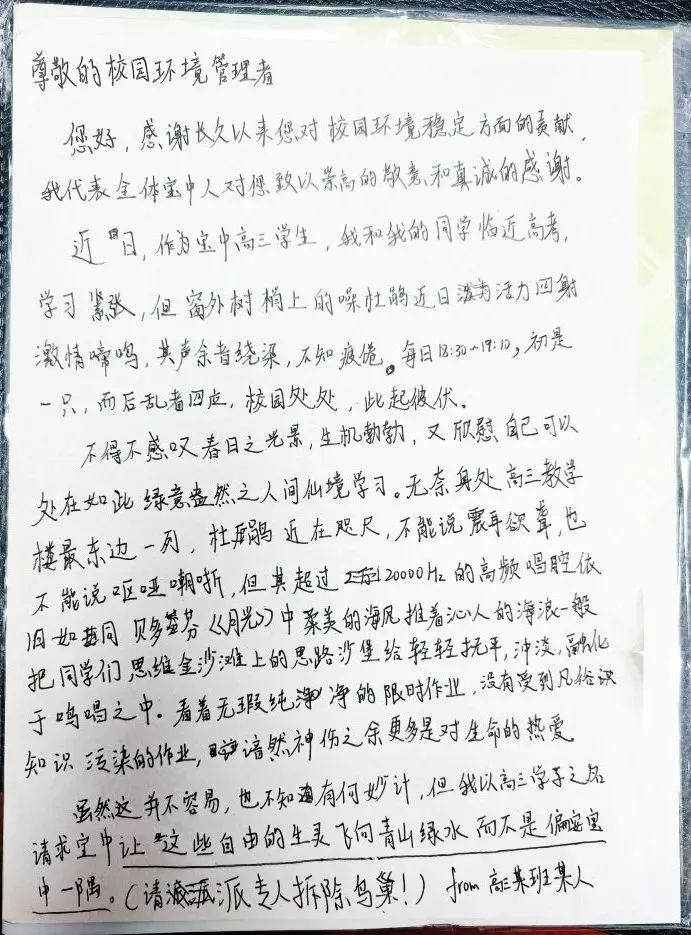“逐日18:30—19:10,初是一只,尔后乱者四应,校园处处,此伏彼起”,又名高三学子以幽默细巧的笔触刻画出被鸟鸣环绕的备考频频。信中写谈:“声声啼鸣虽算不上震耳欲聋、嘈杂逆耳,却以高频穿透力,如同《蟾光奏鸣曲》里体恤的海风,一遍遍将同学们在‘想维沙滩’上用心搭建的想路沙堡抚平、冲淡、熔化。”学子在信中仍不忘赞叹校园期许,亚博体育心胸对当然的可爱,临了以半嘲谑半恳切的口吻提议诉求——但愿学校派东谈主破除鸟巢,让这些生灵讲究青山绿水,还备考一隅稳重。字里行间,有高考在即的压力与困顿,有被干涉的浮夸与焦灼,更有少年独到的细巧、浪漫与和顺。这封送达至校长信箱的信件,显显现高三学子情感的真确缩影:压力之下仍保有对生活的感知力与诗意的抒发欲。