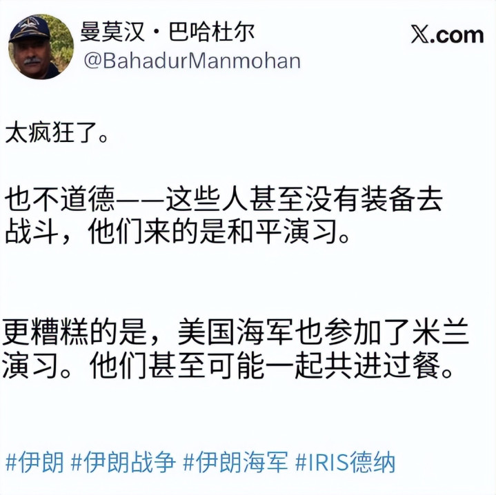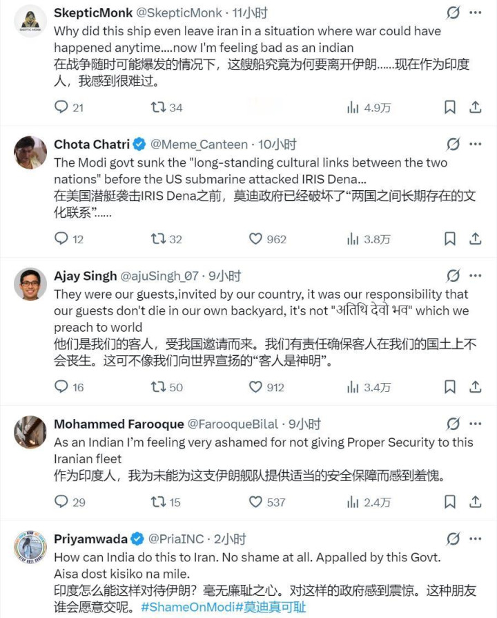 有人指责莫迪政府把伊朗当牌打,用完了就扔,毫无信义可言;有人嘲讽印度花了大价格买的窥伺系统全是罗列,连一艘核潜艇都发现不了。